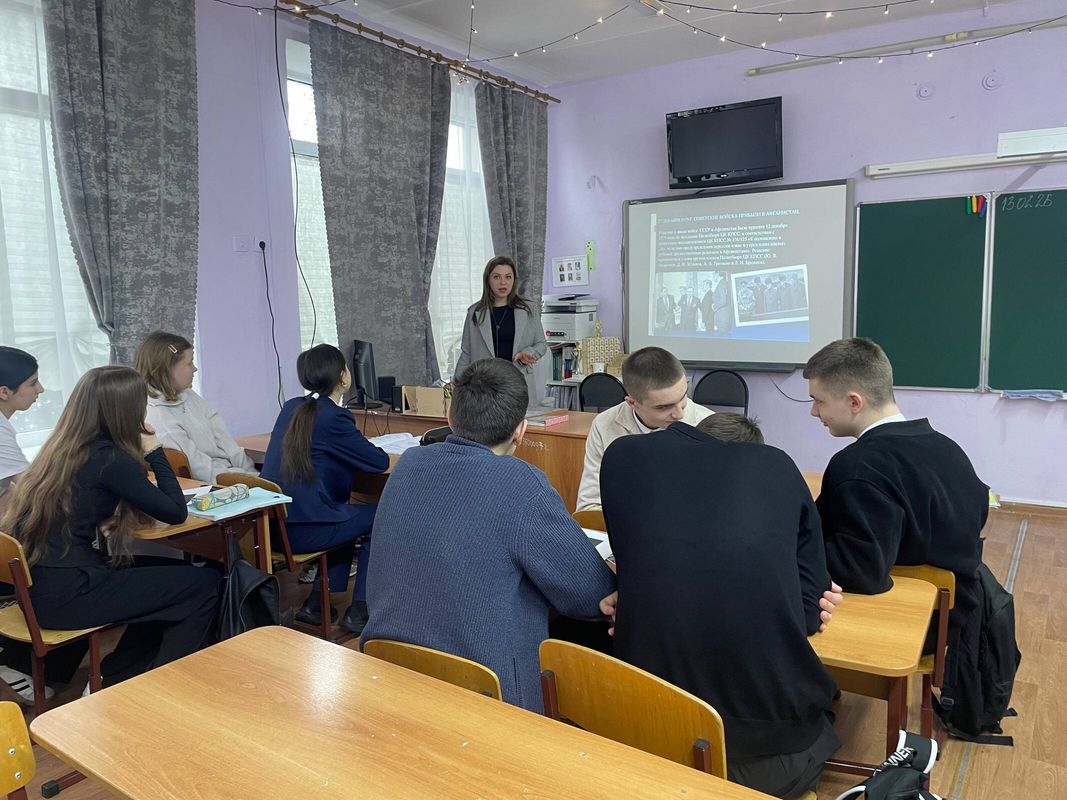 Учитель истории и обществознания Марина Аршавировна Колесниченко провела в 10 «А» классе глубокий и содержательный урок, посвящённый Афганской войне.